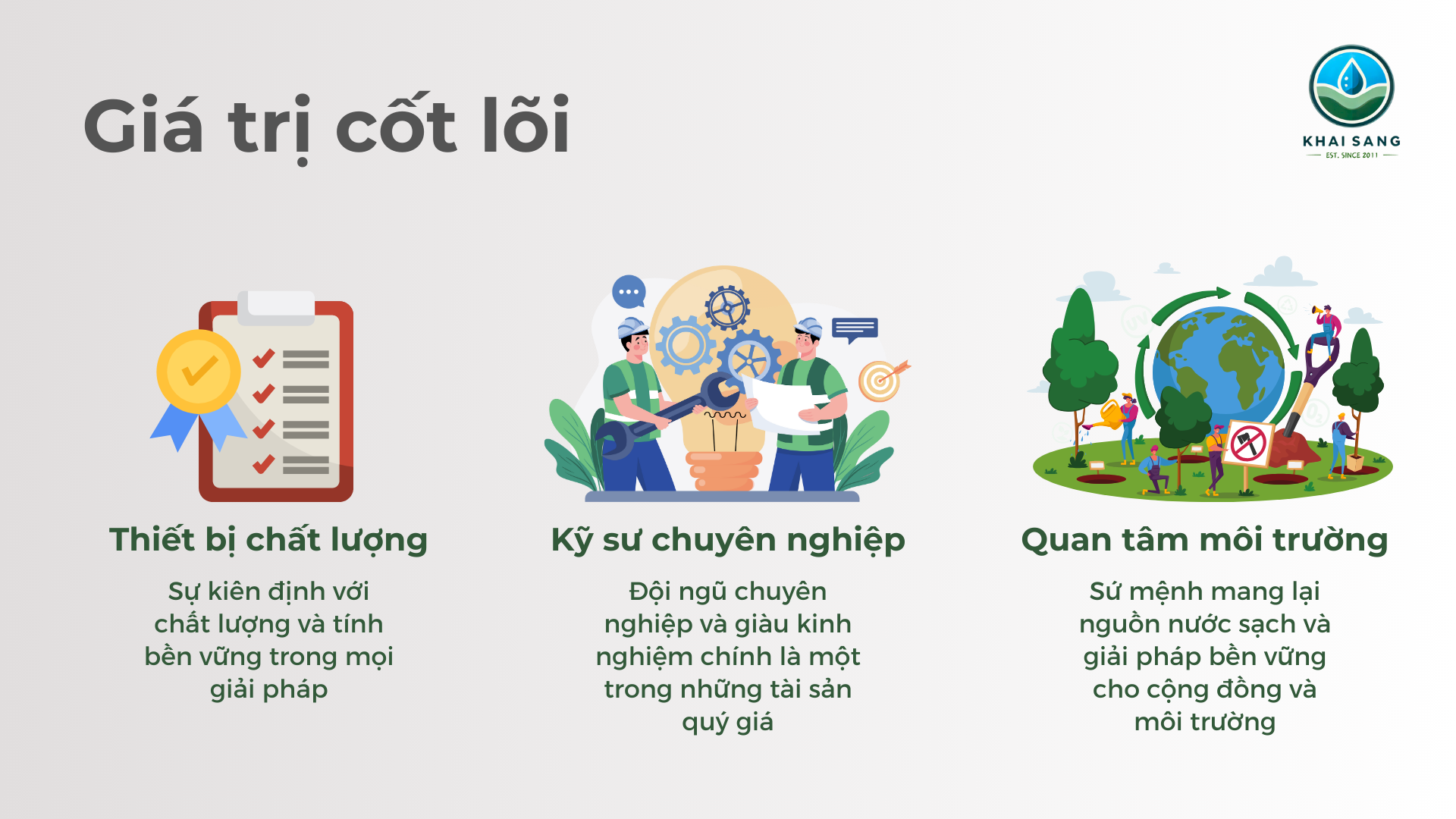 Giá trị cốt lõi của Khai Sáng chính là sự cam kết cung cấp thiết bị chất lượng cao với giá trị tương xứng, đồng thời mang lại các giải pháp hướng đến sự bền vững cho khách hàng. Chúng tôi hiểu rằng trong bối cảnh kinh tế nhiều biến động, chất lượng và độ bền của thiết bị càng trở nên quan trọng. Với mỗi sản phẩm, từ đồng hồ nước, máy bơm nước đến ống lọc giếng và thiết bị khử trùng, Khai Sáng luôn đảm bảo đạt tiêu chuẩn quốc tế, nhằm đáp ứng tối đa nhu cầu sử dụng nước an toàn và hiệu quả cho các doanh nghiệp và hộ gia đình.